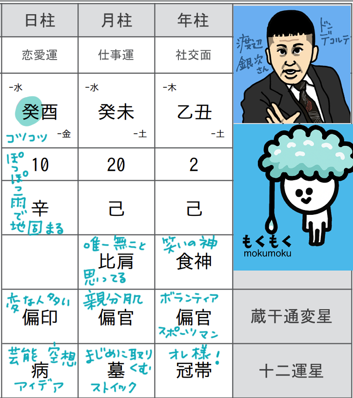 銀次さんの独特のスタイル!めっちゃ好き。あのうさんくさそうな演説を前のめりに聞きに行きたいです。意外にも銀次さんは癸酉(みずのととり)で、隣にも癸が並んでいます。この癸というのは雨や雨雲を表していますから、ザーザー降ってる感じですね。