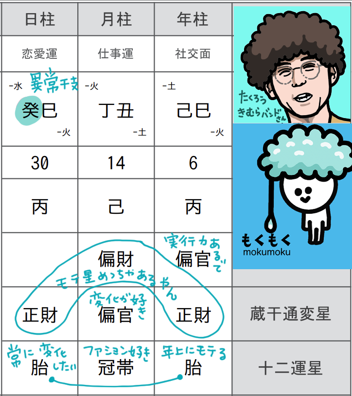 陰陰コンビのたくろう、陰陽コンビのドンデコルテ、陽陽コンビのエバースと3パターンになりました。それにしてもお笑いの人たちは食神・偏財・墓を持っている人が多い😌エンターティナーの星とお笑いを掘り下げていく星とで、極めていくのかなと思ったりします。