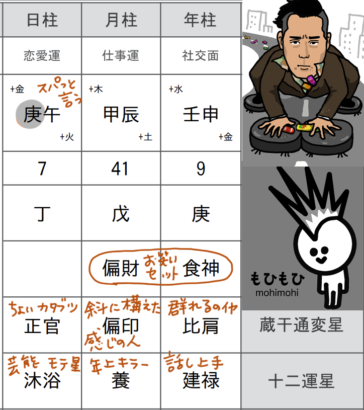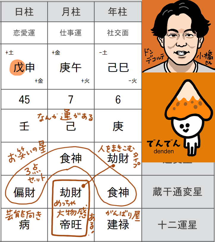それに対して小橋さんは戊申(つちのえさる)、日照り続きでカラカラの山って感じなので、雨が降って欲しいといった具合です。相性としては戊ー癸の干合(かんごう)なので、ぶつかる部分はあるけど、なんだかんだまた戻るって感じの仲。