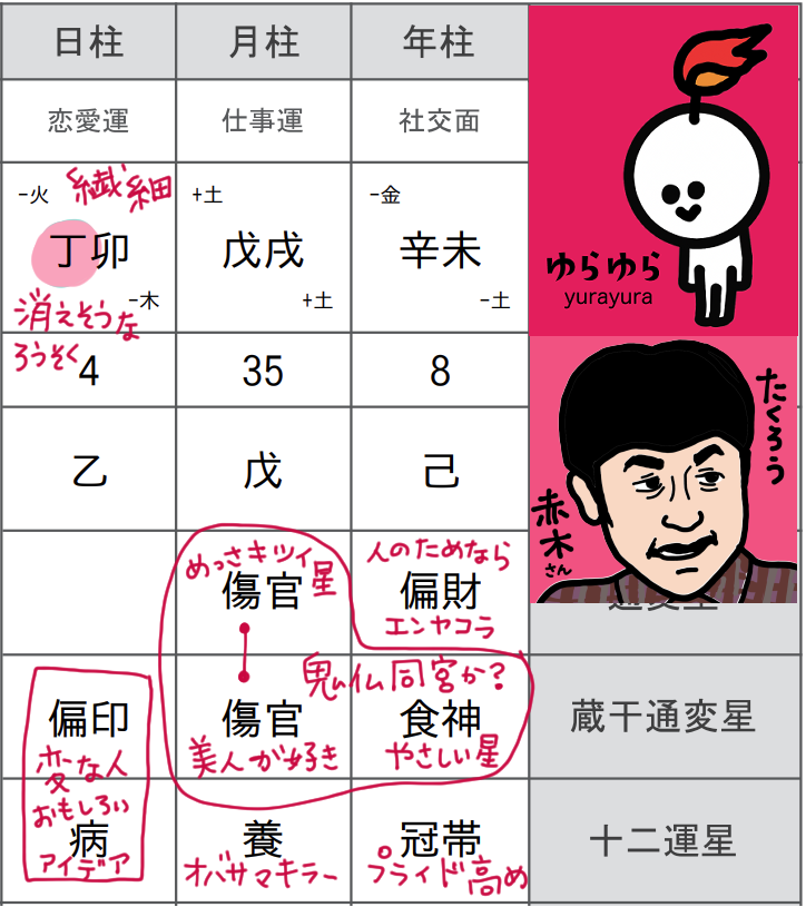 エバースのお二人も面白かった!この2人は両方ともがキャラが立ってますね。同じ年生まれで、町田さんは庚午(かのえうま)で佐々木さんが丙戌(ひのえいぬ)。お二人の全ての柱が陽なのね!佐々木さんは町田さんに後押しされて、どんどん上へ燃え上がる炎で、その炎で町田さんを鍛え上げている🔥って感じですね。お互い良い作用なのでは?と思います。