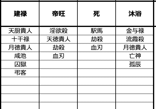 神殺の殺の方のは羊刃、魁ごう、孤辰、寡宿、淫欲殺、血刃、白虎殺、妨害殺、喪門、亡神、紅艶殺…など他にも多数あります。名前だけ見ると、ちょっと身構えてしまいますよね。人によっては下の図のように神殺がたくさんついてくることがあるので